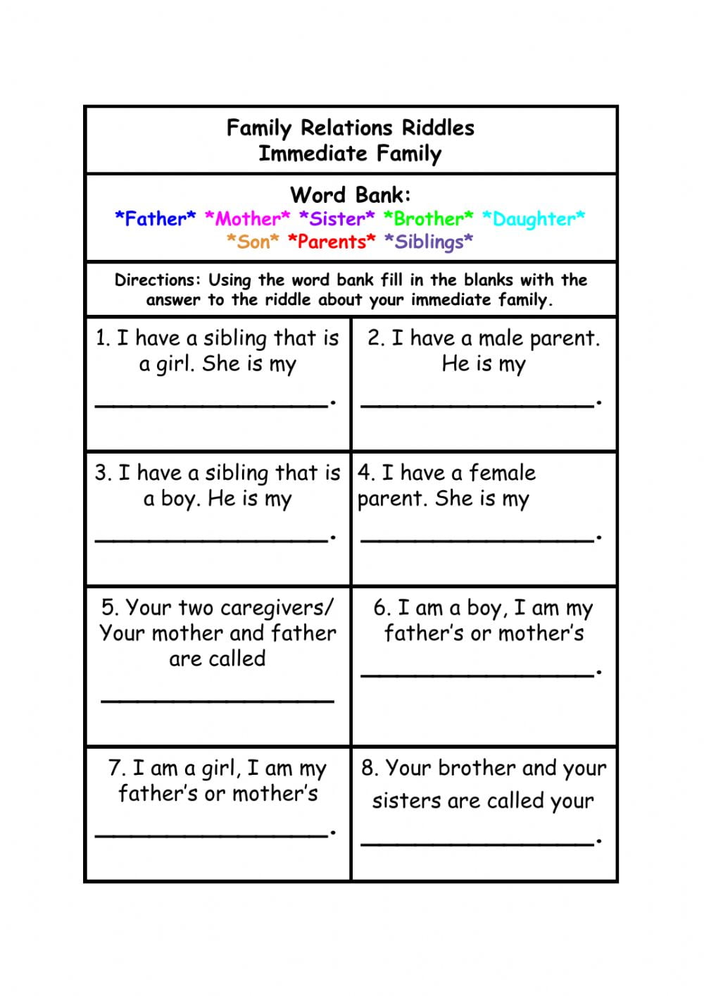 Family Names Word Bank Worksheets