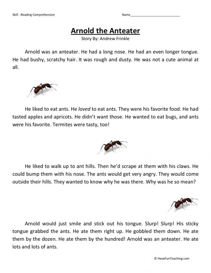 Arnold The Anteater Reading Comprehension Worksheets
