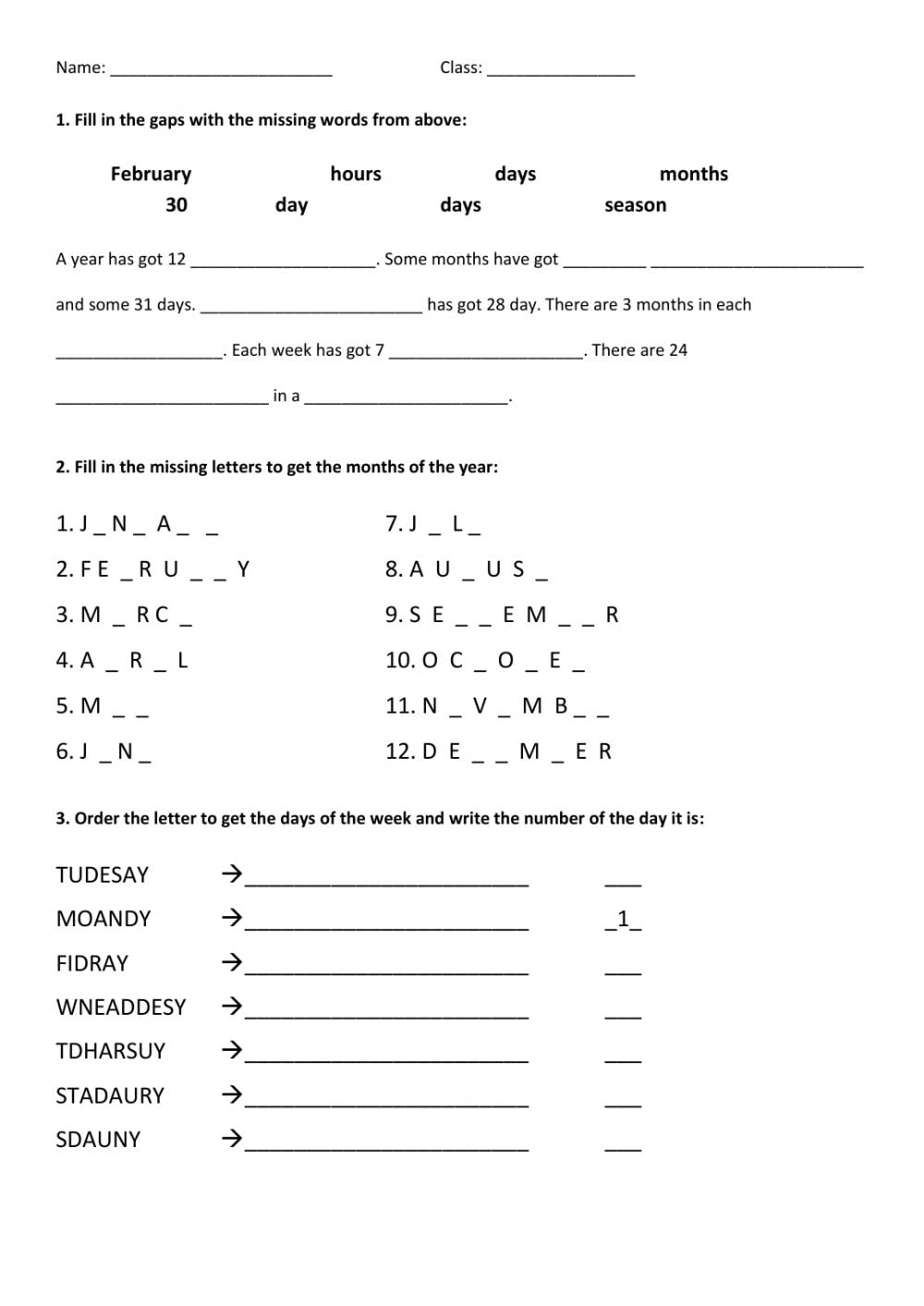 Number Of Days In Months Worksheetsr