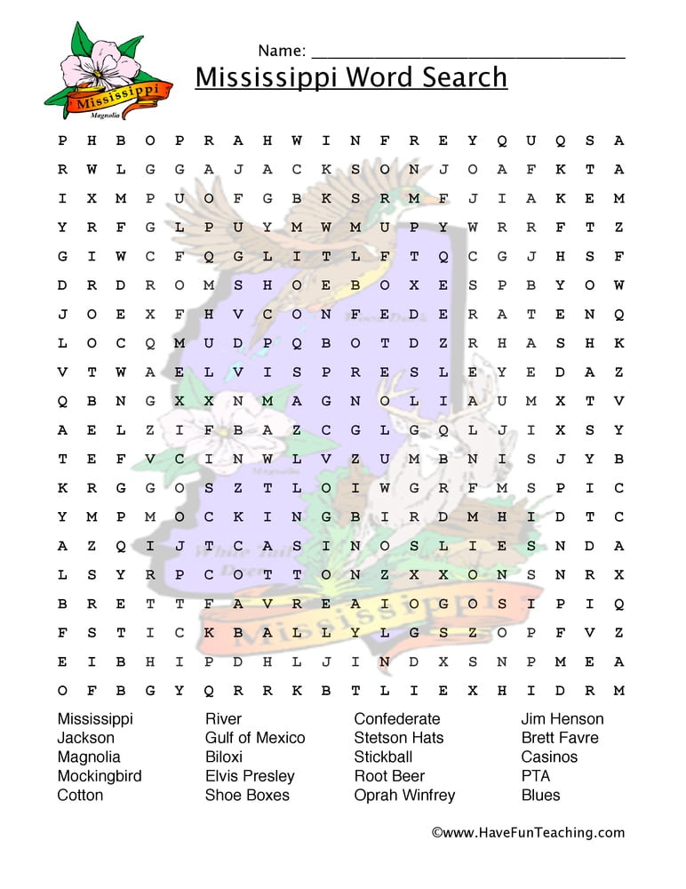 Mississippi Word Search Worksheets