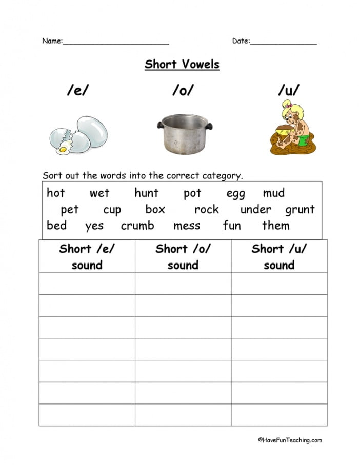 E, O, U Short Vowels Worksheets